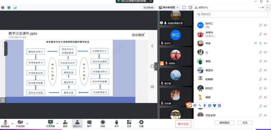 本次教学沙龙共邀请了10位体育专选班骨干教师,分享了自己多年来在专选课教学中的成功经验。何忠院长对整个活动进行了总结,并要求所有教师在上好课程的同时要注重提升五个意识,即通过课程教学提升专业素养意识,提升学生实践能力意识,提升课程建设意识,提升教学研究意识、提升课程思政意识。