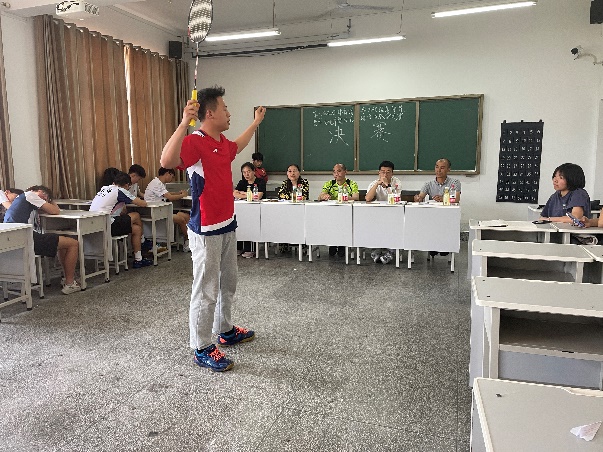 比赛采用无生课堂形式,每人限时七分钟教学羽毛球技术动作。参赛选手们热情饱满,声音洪亮。评委老师在每位选手教学完动作后一一进行点评和评分。