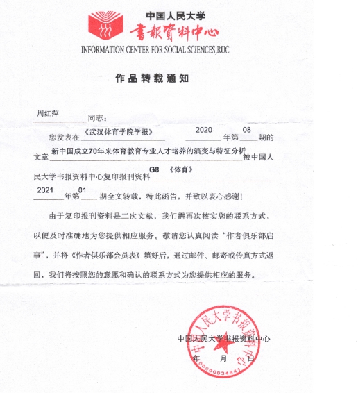 [通讯员 张娟]日前,从中国人民大学传来喜讯——我校周红萍老师撰写的论文《新中国成立70年来体育教育专业人才培养的演变与特征分析》,系统的研究了体育教育专业建国70年来,在发展规模、专业定位、培养方案、课程设置、教学模式等人才培养方面特征与演变规律,呈现体育教育专业发展历史的脉络,是推动体育教育专业发展和改革的一项基础性工程。(原文发表于《武汉bwin必赢中国官网学报》2020年第8期)被人民大学复印资料G8《体育》2021年第1期全文转载。