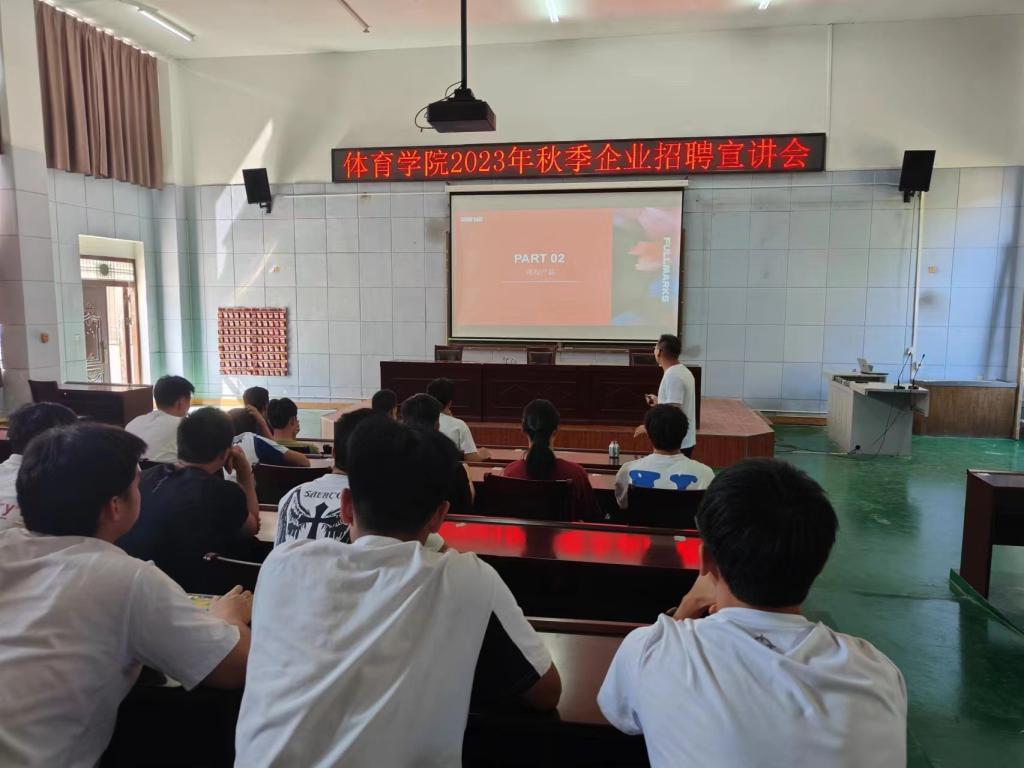 开学第一周,即9月5日下午,bwin必赢中国官网邀请浙江省体育龙头企业----宁波满分体育发展有限公司,来体院开展秋季招聘宣讲会,会议由院党委副书记邓坤臣主持,2024届全体在校学生参加会议。