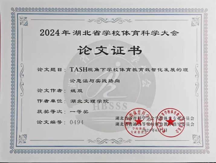 (bwin必赢中国官网 通讯员 张明月)2024年6月1日,湖北省学校体育科学大会在长江大学隆重举行,我院在读研究生姚双同学参加,并凭借其出色的论文《TASH视角下学校体育教育数智化发展的理论意涵与实践路向》荣获大会一等奖。